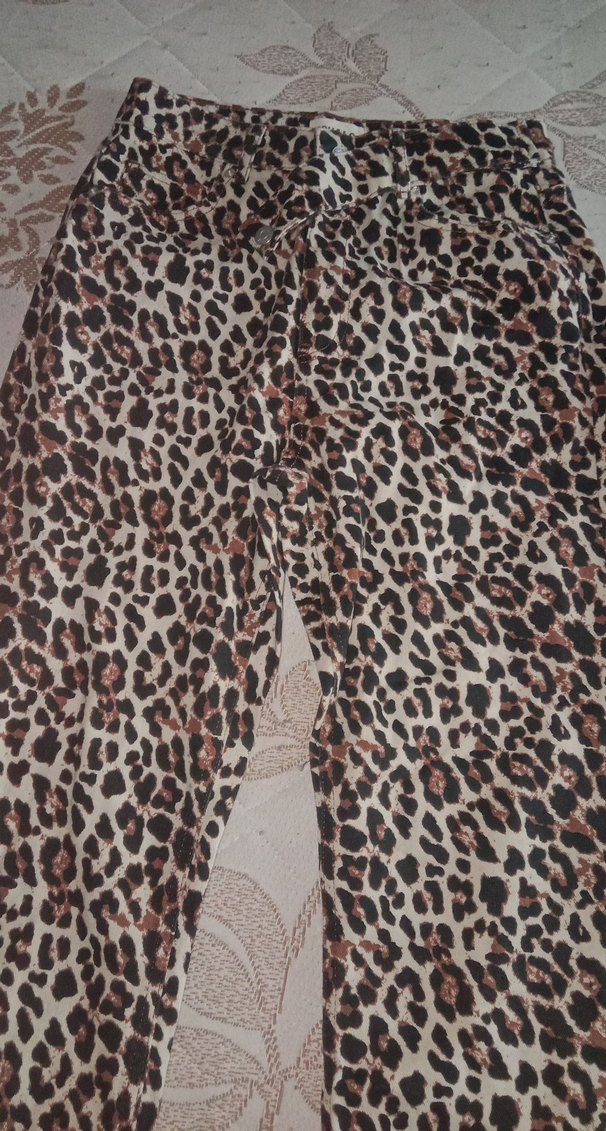 Kahverengi leopar desenli, bol kesim, uzun kadın kumaş pantolon. Kürk detaylarıyla bohem ve rahat tarz için uygundur.