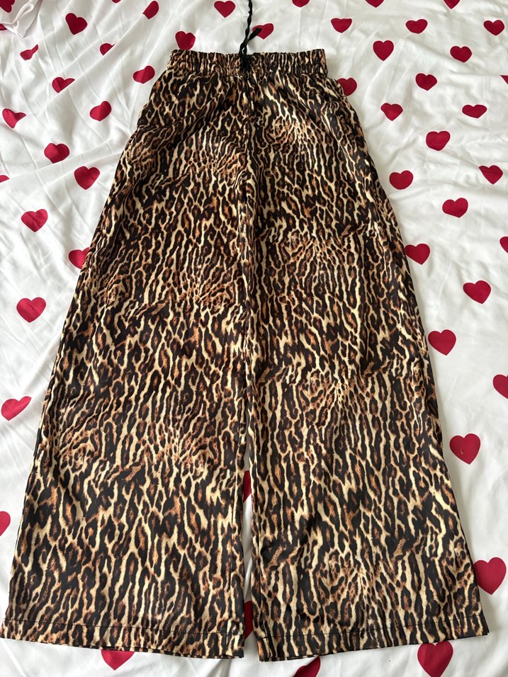 Kahverengi leopar desenli, kürk detaylı bol kesim kadın kumaş pantolon. Uzun boy, rahat ve sokak stiliyle romantik akşamlar için uygundur.