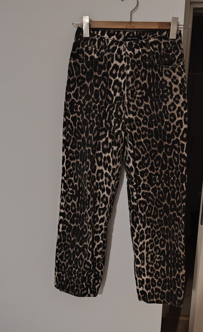 Kahverengi leopar desenli, kürk detaylı, midi boy, dar kesim kadın kumaş pantolon, rahat sokak stili için ideal.