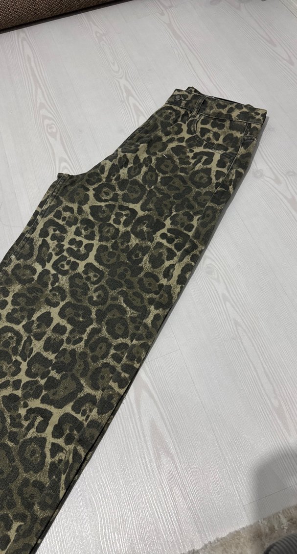 Kahverengi leopar desenli, kürk detaylı, bol kesim kadın pantolon. Street style için uygun, günlük kullanıma ideal uzunlukta.