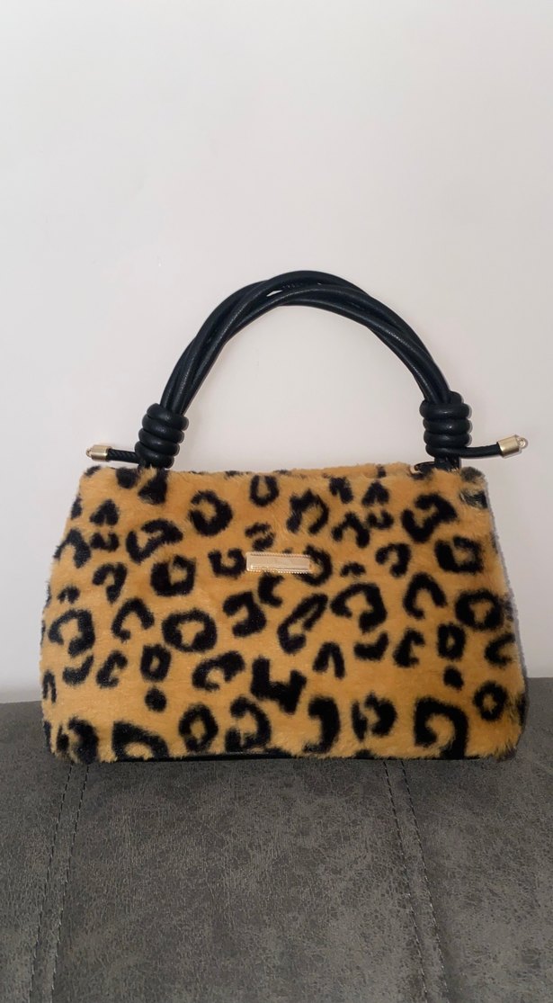 Kahverengi leopar desenli, kürk detaylı ve siyah saplı kadın çantası. Sentetik kumaştan, rahat ve bohem stil için uygun. Sıfır hiç kullanılmamıştır