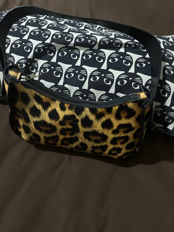 Kahverengi leopar desenli, tokalı askıya sahip kadın makyaj çantası. Sentetik kumaştan üretilmiş, sokak stili ve avangart moda tarzına uygun.