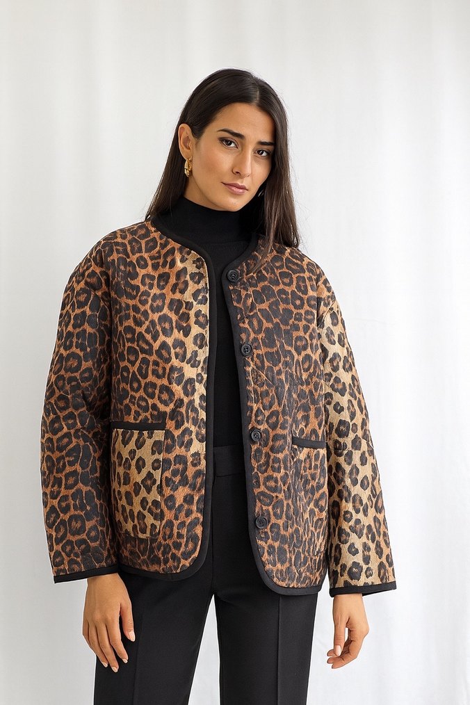 Kahverengi leopar desenli, kapitone detaylı kadın ceket. Bol kesim, uzun kollu ve yuvarlak yaka, midi boyda, günlük kullanım için uygun.