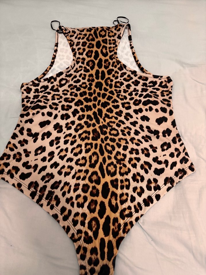 Kahverengi leopar desenli, kolsuz ve vücuda oturan bu monokini, kürk detaylarıyla cesur bir sokak stili sunar.