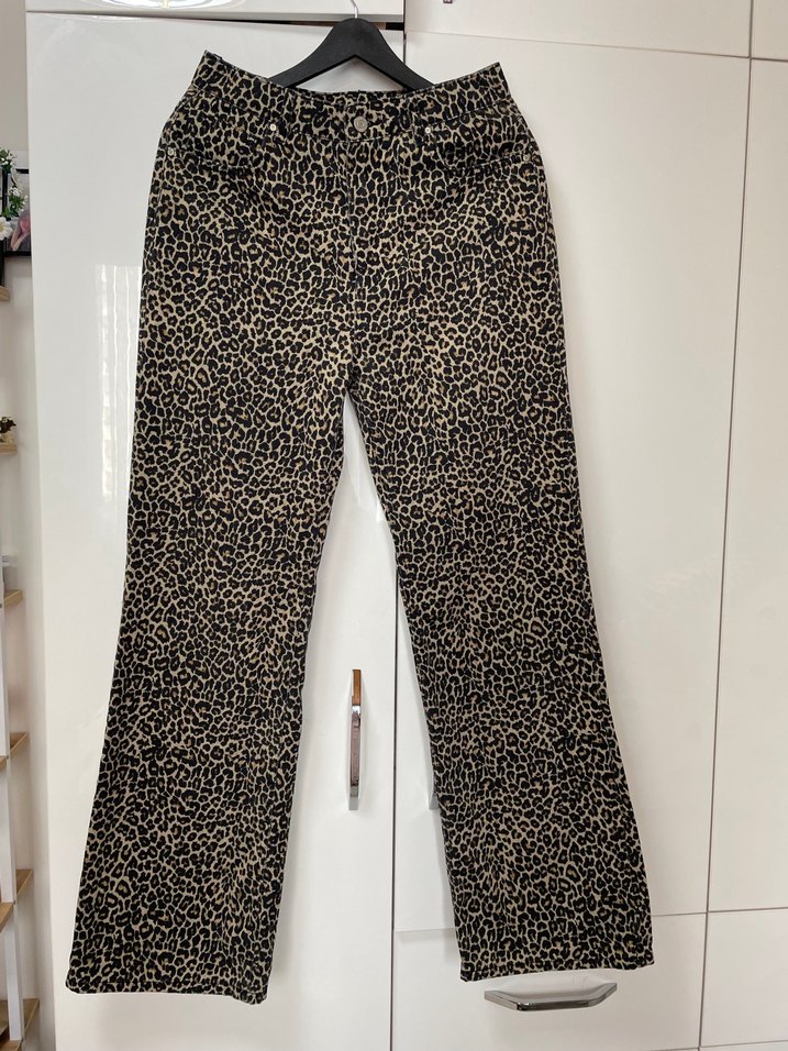 kahverengi leopar desenli, kürk detaylı, bol kesim kadın pantolon, milla 38 beden