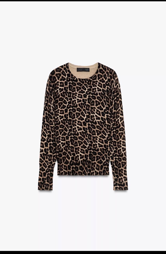 Kahverengi süet kumaştan, uzun kollu, leopar desenli ve kürk detaylı, salaş kesim kadın kazak. Günlük kullanıma uygundur. 1 kez giyildi