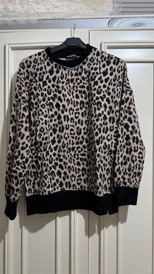 Kahverengi leopar desenli, uzun kollu, bol kesim ve yuvarlak yakalı sweatshirt. rahat bir kullanım sunar.