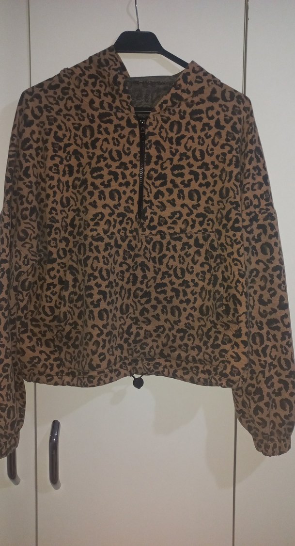Kadınlar için uzun kollu, yuvarlak yakalı ve bol kesim sweatshirt. Yumuşak, sıcak kumaştan yapılmış, koyu kahverengi leopar desenli ve kürk detaylı. Günlük ve sokak stiline uygun midi boyda.