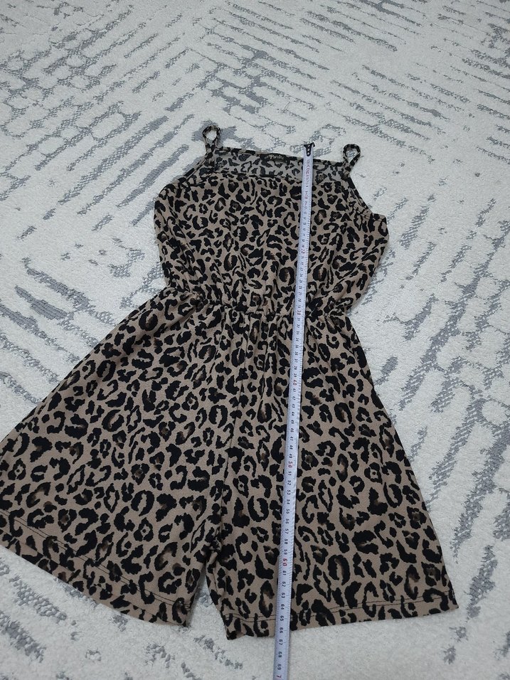 Kahverengi leopar desenli, askılı kısa tulum, bol kesim ve kürk detaylıdır, rahat dış mekan kullanımı için uygundur.