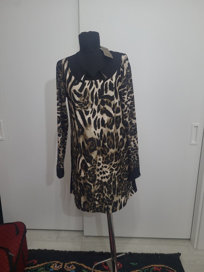 Kahverengi leopar desenli, uzun kollu, yuvarlak yakalı, tunik. Önü ince saten arkası siyah ince triko. Tesettür tunik olarak da kullanılabilir