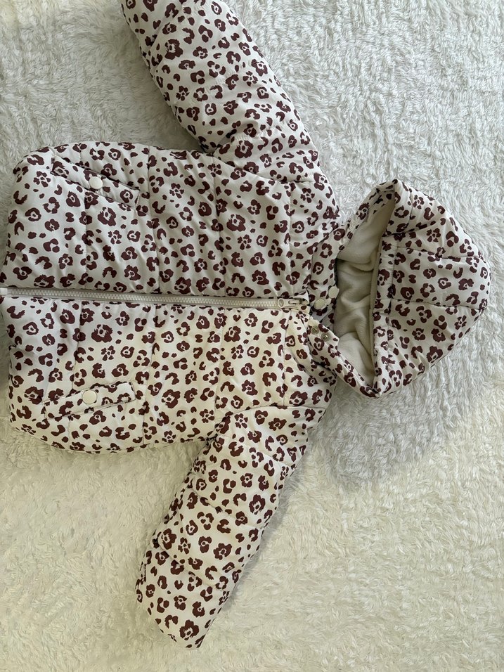 Kapüşonlu, kahverengi leopar desenli, içi polarlı bebek montu, sıcak tutar. Çok az kullanıldı yeni gibi.