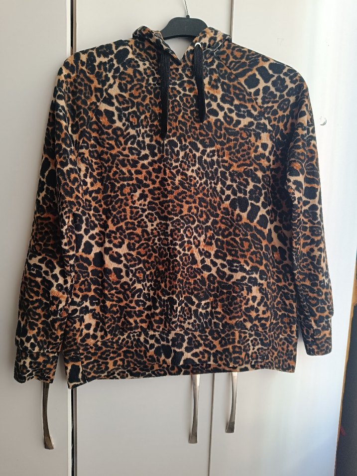 Kahverengi leopar desenli, kapüşonlu, uzun kollu, bol kesim kadın ceketi. Yumuşak sentetik kumaştan, kürk detaylı, rahat kullanıma uygun.