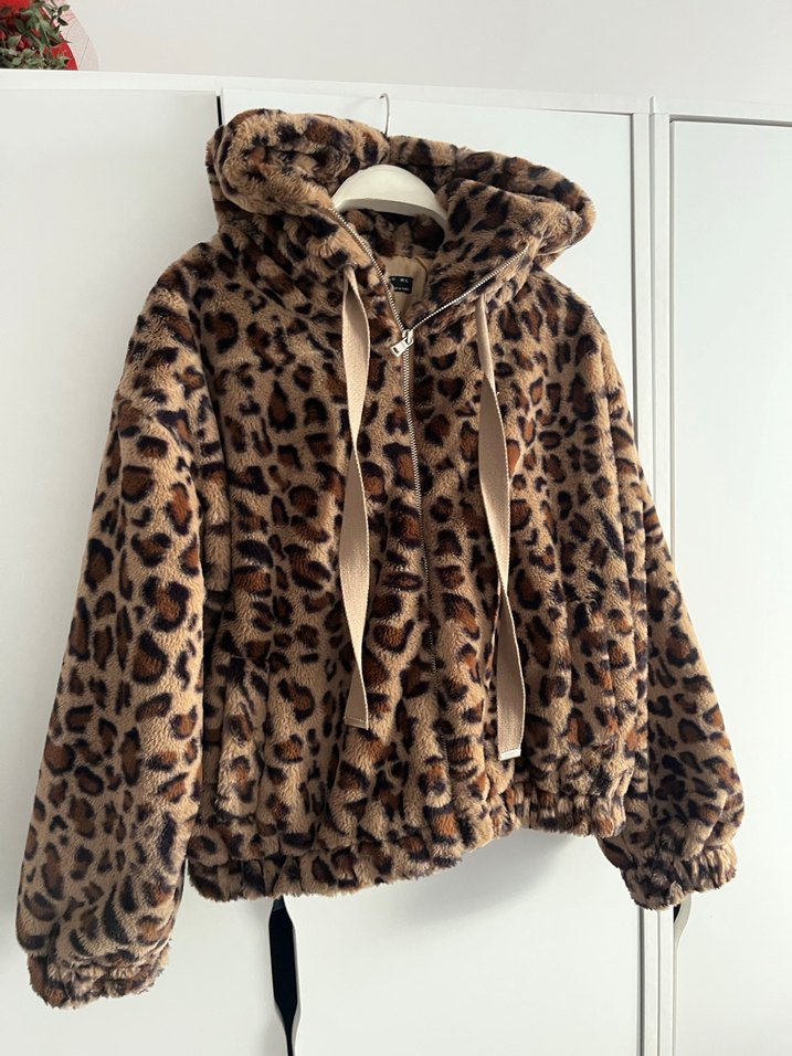 Kahverengi leopar desenli, kapüşonlu, uzun kollu, bol kesim kadın ceket. Yumuşak ve sıcak kumaştan üretilmiştir, günlük rahat stil için uygundur.