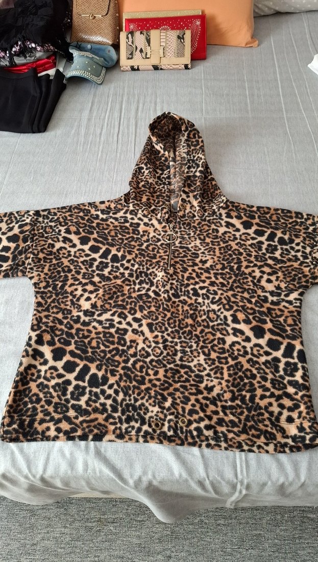Uzun kollu, kapüşonlu ve bol kesim kadın sweatshirt. Kahverengi leopar desenli sentetik bol kumaştan rahat bir model. Boy:56cm Bel:52cm iade yoktur.
