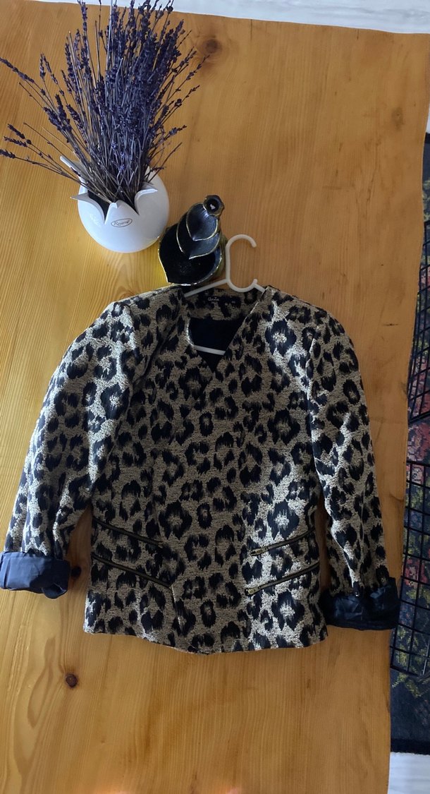 Kahverengi, leopar desenli, sokak tarzı kedi ceketi, kürk detaylı ve dokulu bir görünüme sahip.