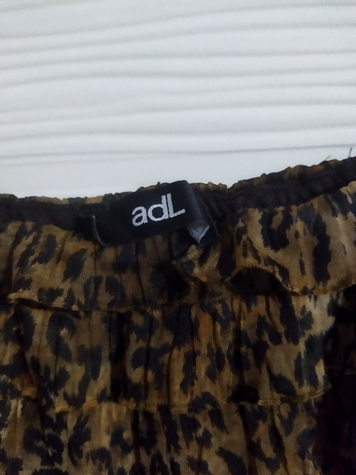 Kahverengi leopar desenli, fırfırlı kedi elbisesi, adL markasına ait sokak stili görünümü sunar.