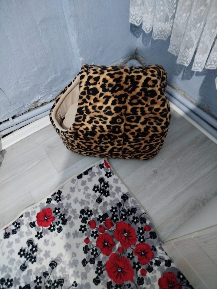 Kahverengi leopar desenli yumuşak iç yüzeye sahip kedi evi, kediniz için rahat bir saklanma alanı sunar.