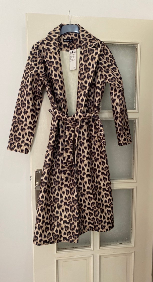 Kahverengi leopar desenli uzun kadın kaban, kemerli ve yakası kesik detaylıdır. Rahat ve sıcak sentetik kumaştan üretilmiş, şık ve fitted kesimdir.