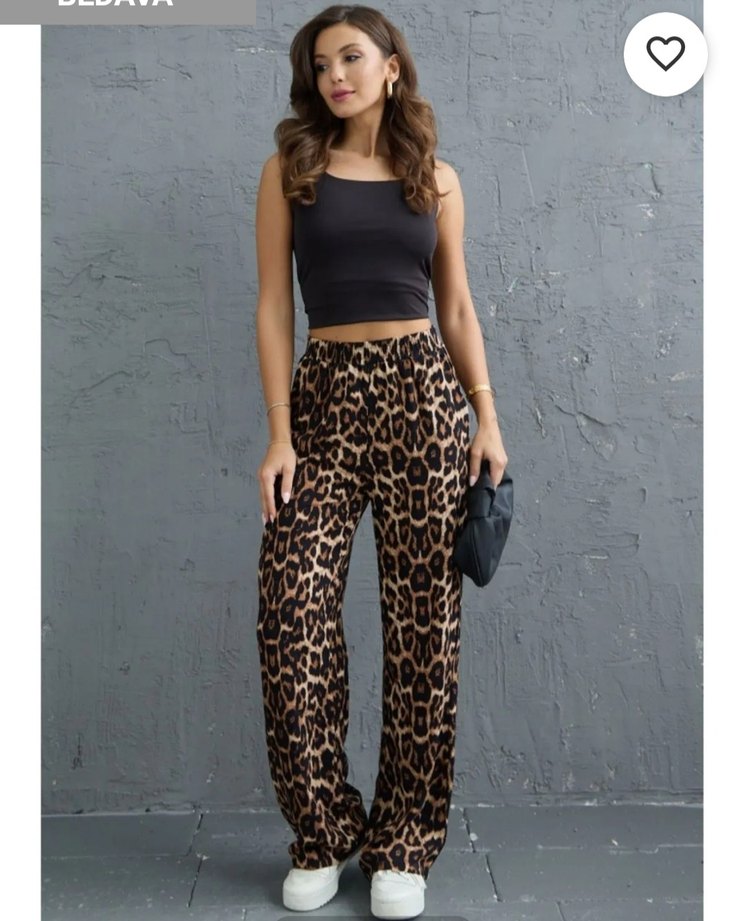 Sentetik kumaştan, kahverengi leopar desenli, cebli ,beli lastikli bol kesim kadın pantolon. rahat sokak stiline uygun. L beden