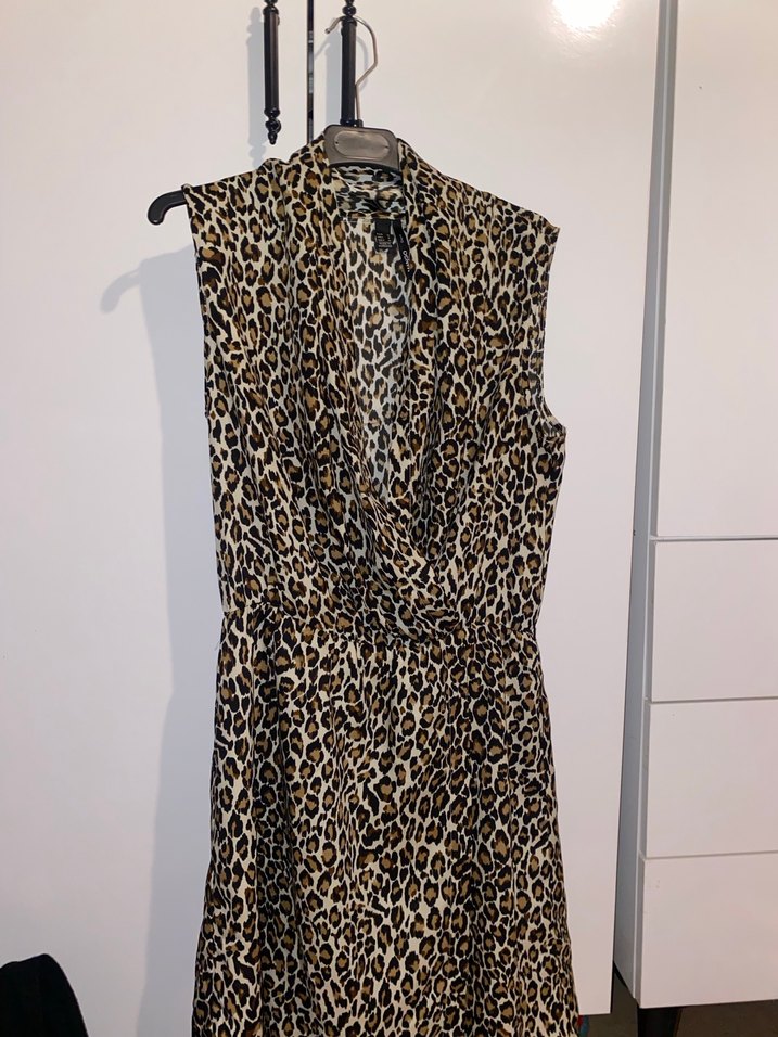 Kahverengi leopar desenli, kemerli, V yakalı ve kolsuz, vücuda oturan kadın tulumu, sentetik kumaştan, sokak modasına uygun.