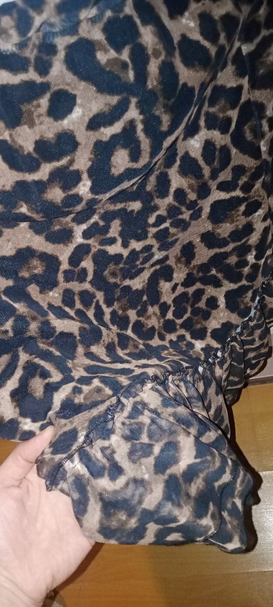 Koyu kahverengi leopar desenli, yumuşak sentetik kumaştan kısa ve dar eteği. Bohem tarzda, günlük kullanıma uygun.