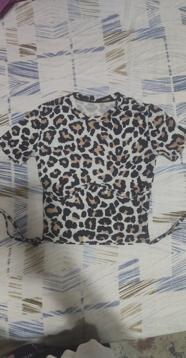 Kahverengi leopar desenli, kısa kollu, bisiklet yaka ve kuşaklı, sentetik kumaştan yapılmış, kısa kesim ve dar kesimli kadın bluzu.
