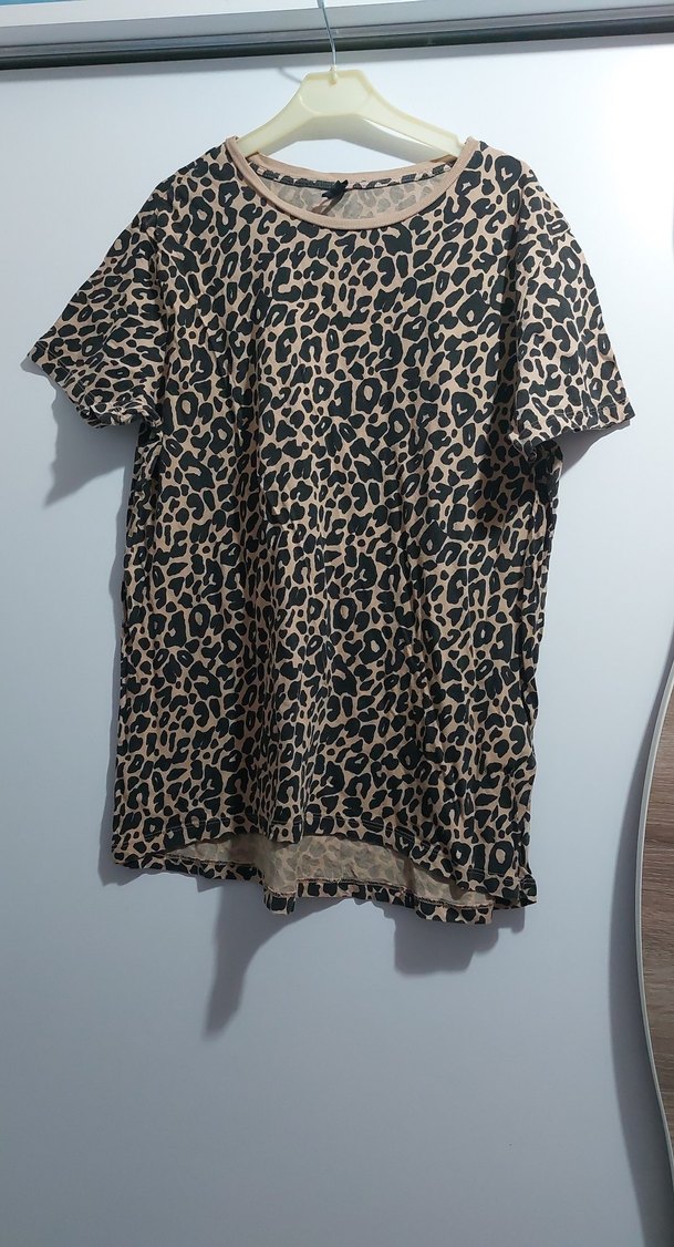 Kahverengi leopar desenli, kısa kollu ve bol kesim tişört. Kumaşı tekstil, yuvarlak yaka ve normal midi uzunlukta. Sokak stili için uygun.