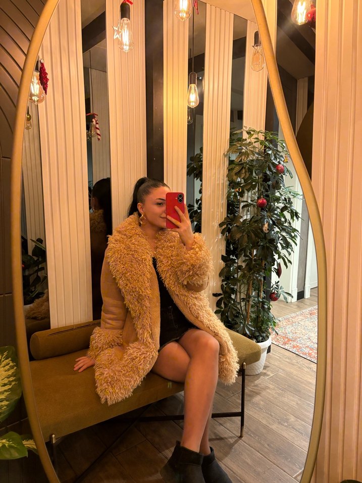 Koyu kahverengi leopar desenli, kısa ve fitted kesim suni kürk mont, yakalı ve uzun kollu, cesur sokak stili için ideal. İçinde S beden yazıyor 75 kiloya kadar oluyor