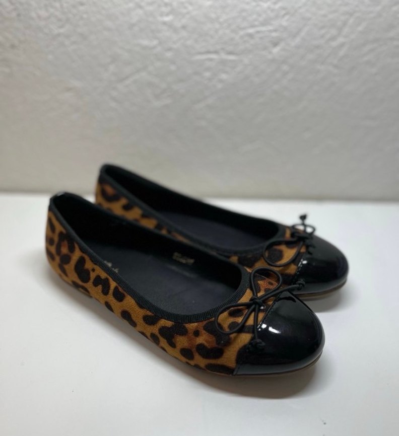 Kahverengi leopar desenli, blok kauçuk topuklu kız babet, klasik zarafeti buluşturuyor.