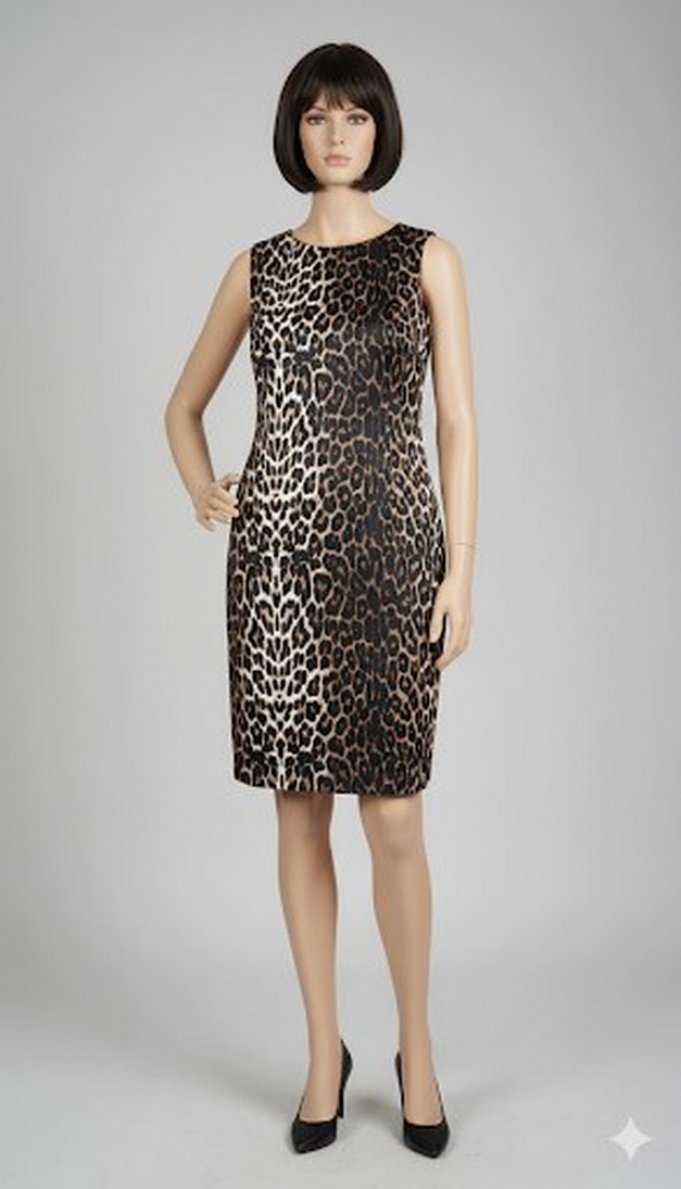 Kahverengi leopar desenli, kolsuz ve V yakalı, kürk detaylı, ofis için uygun midi kesim dar elbise.