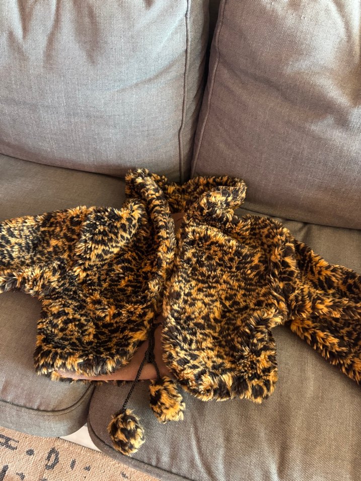 Kahverengi, koyu leopar desenli, kürk detaylı, sokak tarzı kedi kıyafeti. Yumuşak dokulu ve ponpon bağlamalıdır.