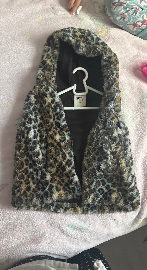 Kahverengi leopar desenli, kürk detaylı, yakalı ve kolsuz kız yeleği. Sentetik kumaştan, bohem tarzda rahat ve şık.