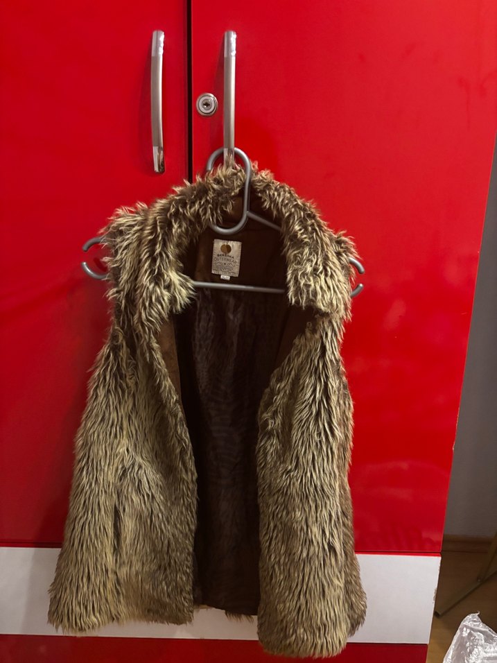 Kahverengi leopar desenli, kürk detaylı, normal boyda, kesimi vücuda oturan kolsuz yelek. Yumuşak kumaştan yapılmış, günlük sokak tarzına uygun.