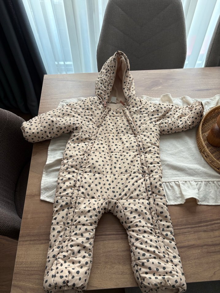 Kahverengi leopar desenli, kürklü detaylı ve kesimli yakalı bebek tulumu, soğuk günler için sıcak tutar. Ayak kısmı açık olduğu için kullanımı kolay . Kalıbı biraz büyük. Etiketi 6/9 ama biraz büyük