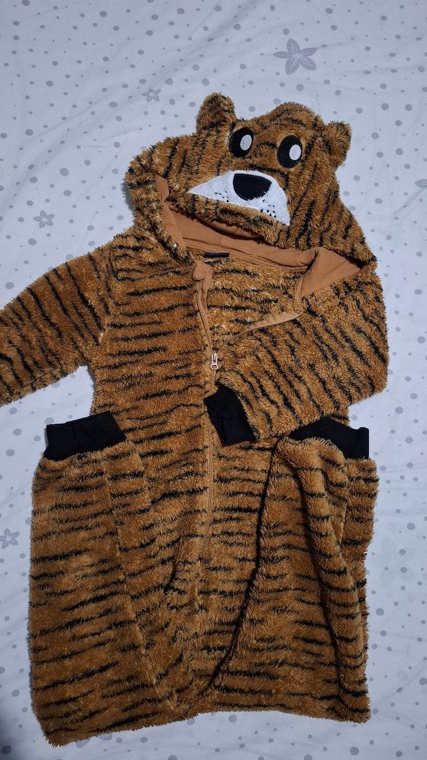 Kahverengi leopar desenli, yumuşak ve sıcak kumaştan yapılmış, kapüşonunda sevimli hayvan yüzü detaylı kürklü bebek tulumu. Siyah manşetleri ve fermuarlı kapanışı vardır.