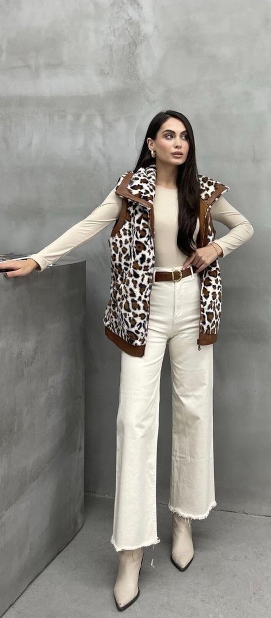Kahverengi deri taban üzerine leopar desenli kürk detaylarıyla tasarlanmış, yakalı ve kolsuz, normal midi boyda, sokak stilinde günlük kullanıma uygun, trend ve rahat bir kadın yeleği.