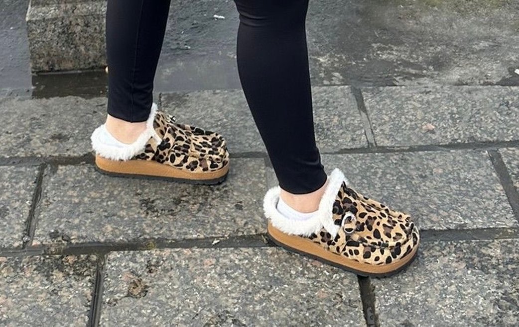 Kahverengi leopar desenli, kürklü ve platform tabanlı kadın terlik. Rahat ve şık, günlük kullanım için uygundur.