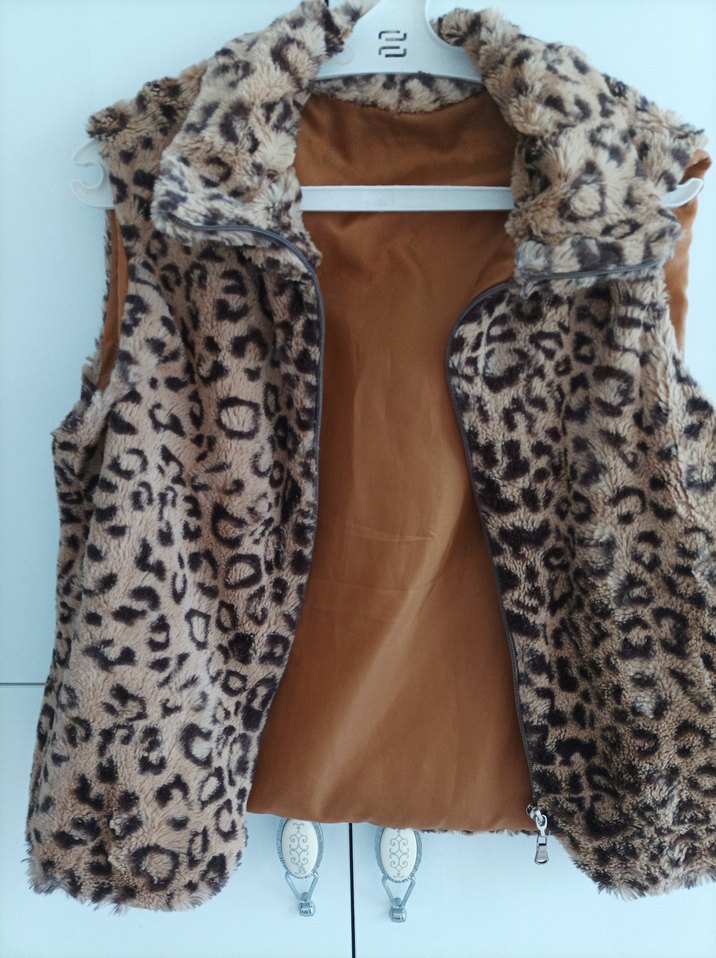 Kahverengi, leopar desenli ve kürklü detaylı, kolsuz, Günlük kullanıma uygun.