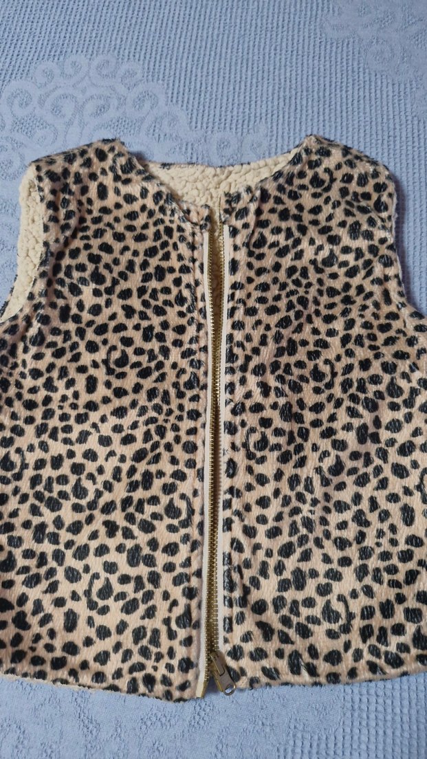 Kahverengi, leopar desenli, kürklü ve kolsuz, V yaka, günlük sokak stiline uygun, vücuda oturan kadın yeleği.