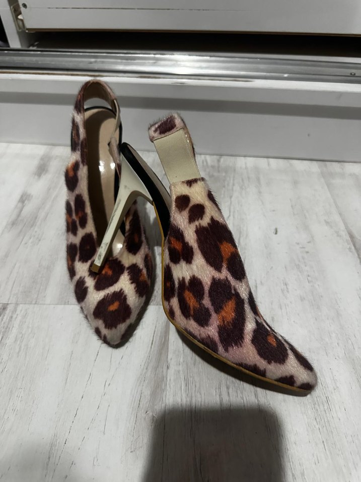 Kahverengi leopar desenli, kürk detaylı ve parlak görünümlü sentetik kumaştan yapılmış çağdaş stilettolar.