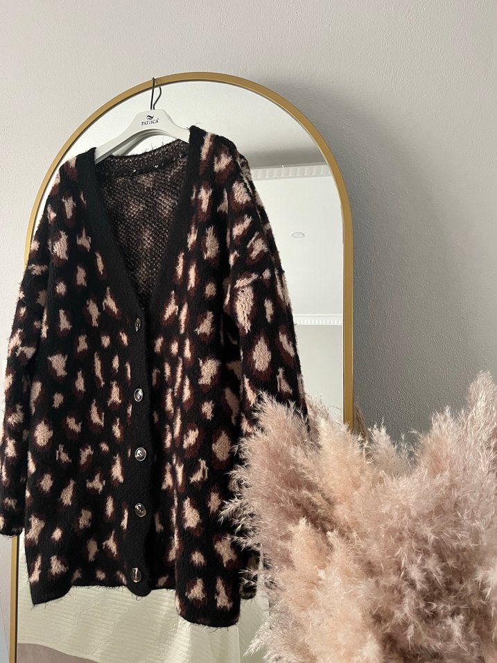 Kahverengi leopar desenli, kürk detaylı bol kesim triko hırka. Uzun kollu, V yaka ve midi boyda, günlük kullanıma uygun rahat bir model.