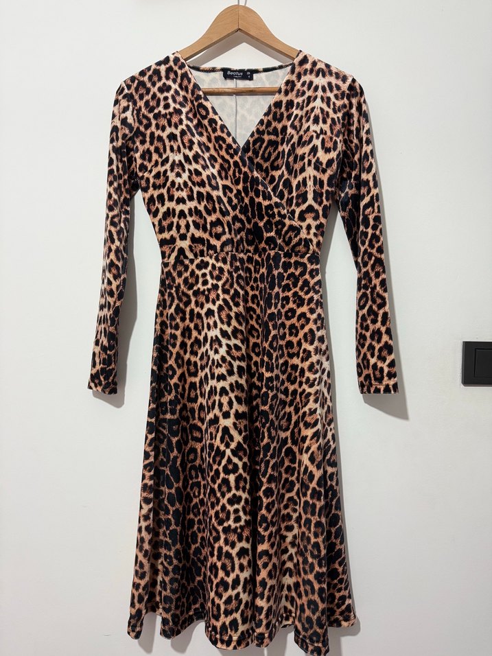 Kahverengi, leopar desenli midi elbise, V yakalı ve uzun kolludur. Fitted kesim ve kürk detaylarıyla bohem ve çağdaş tarzı bir araya getirir.