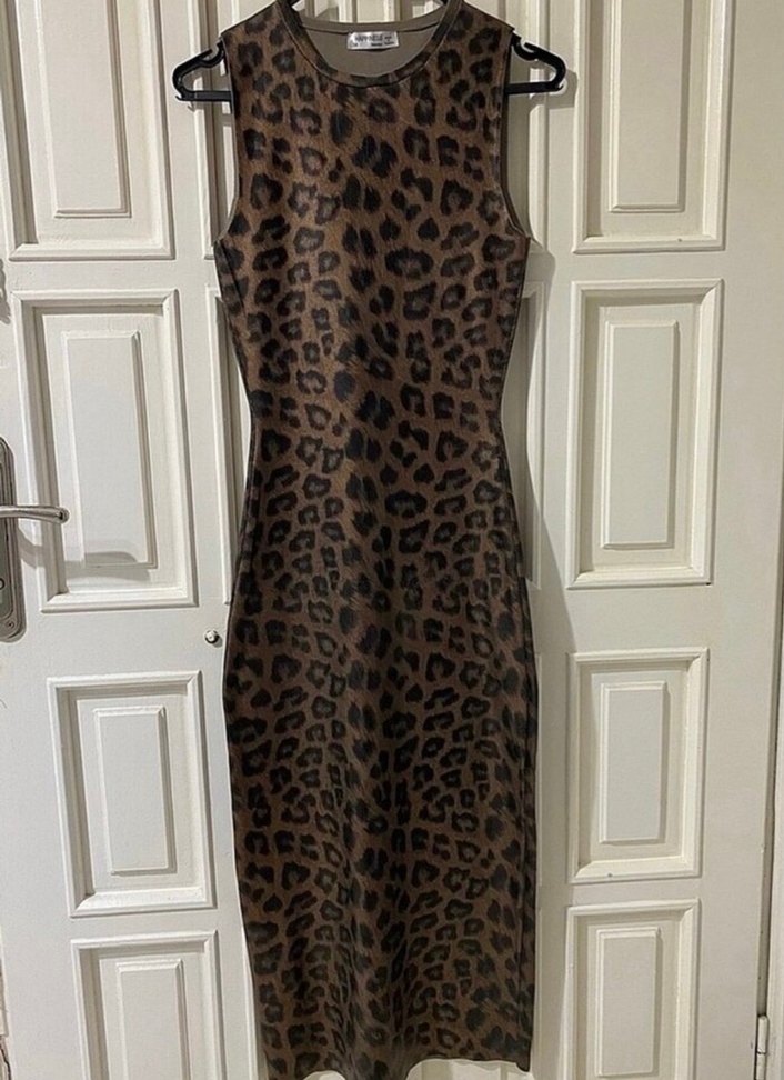 Kahverengi leopar desenli, kolsuz ve v yaka midi boy elbise. Sentetik kumaştan, vücuda oturan kesim ve kürk detaylı, günlük kullanıma uygun.