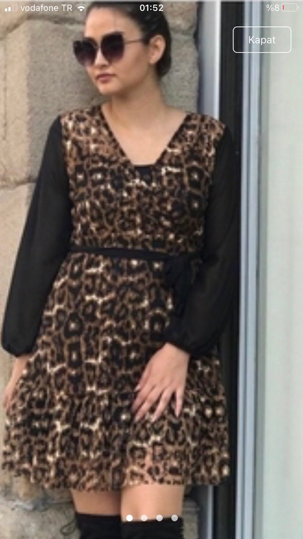 Kahverengi leopar desenli midi elbise, V yaka ve uzun kollu. Sentetik kumaştan, bol kesim ve trend günlük şıklık için uygundur.