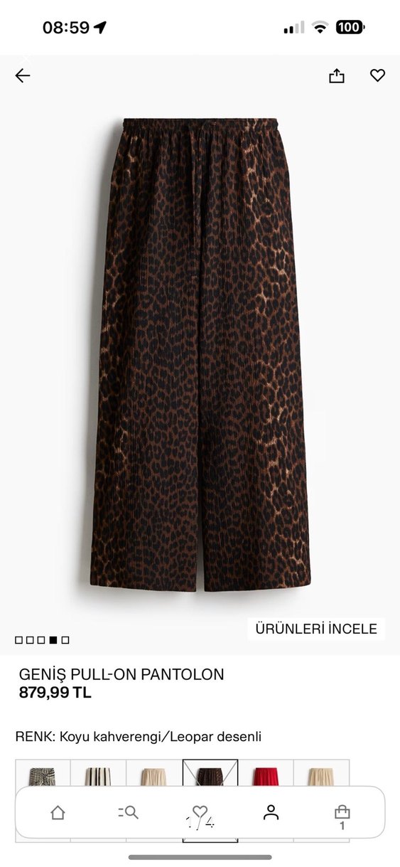 Kahverengi leopar desenli midi pantolon, kürk detaylı ve rahat kesim, yumuşak sentetik kumaştan üretilmiştir. Sokak modası için uygundur. Düğün için 1 kere giyilmiştir
