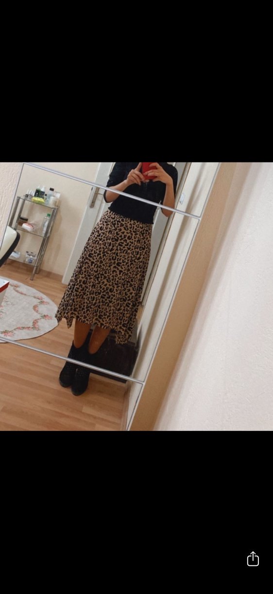 Kahverengi leopar desenli midi uzunlukta, triko kumaştan, tokalı ve bol kesim rahat bir etek.