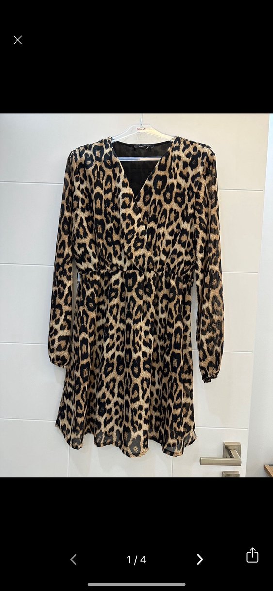 Kahverengi, leopar desenli mini elbise, uzun kollu ve V yakalıdır. Salaş kesimi ve rahat bir görünüme sahiptir. Siyah ince kuşağı mevcuttur söküğü var
