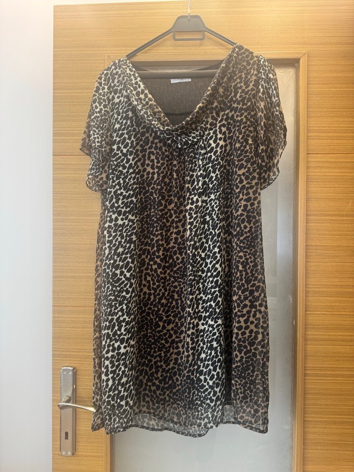 Kahverengi leopar desenli, V yaka, kısa kollu, salaş kesim mini elbise, drapeli tasarıma sahiptir. Tesettür giyim için bluz olarak kullanılabilir