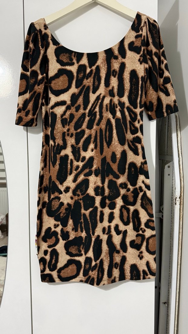 Esnek kumaş.Kahverengi leopar desenli, kürklü detaylı, kısa kollu, tek parça mini elbise. Vücuda oturan kesimi ve kayık yaka tasarımı ile sokak modasına uygun.