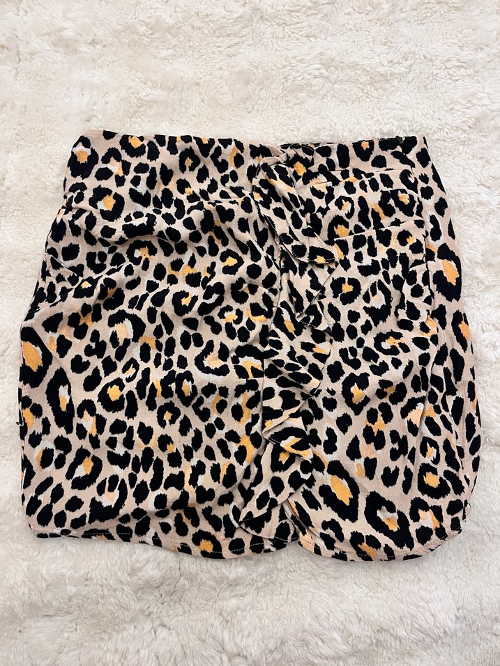 Kahverengi leopar desenli, yumuşak sentetik kumaştan yapılmış, kürk detaylı ve dar kesim mini etek. Kısa boyu ile dış mekan sokak tarzına uygun.